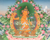 This Arya Bodhisattva Manjushri thangka beautifully depicts Bodhisattva, the revered embodiment of wisdom and enlightenment in Mahayana Buddhism. This high-quality thangka is meticulously hand-painted with exceptional artistry, capturing the divine essence of Manjushri through intricate details and vibrant colors. As the Bodhisattva of Wisdom, Manjushri is celebrated for his ability to dispel ignorance and guide beings toward enlightenment. This thangka is not just a piece of art; it is a profound spiritual tool that invites the blessings of wisdom and insight into one's practice.
