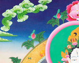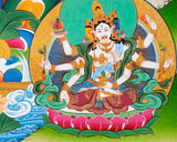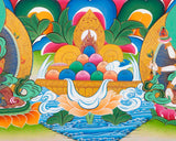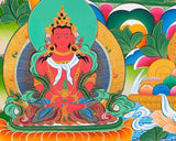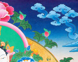 Our Beautifully Hand-Painted White Tara Thangka is a stunning masterpiece of spiritual artistry, meticulously crafted with precision and devotion. This large-sized thangka features White Tara, the embodiment of compassion and longevity, radiating serenity and grace. With intricate details and vibrant colors, the thangka portrays White Tara seated amidst a celestial realm. At the bottom, depictions of Amitayus Buddha and Namgyalma further enrich the spiritual significance of the artwork, symbolizing longevity and safeguarding against obstacles. White Tara, revered for her ability to grant healing and protection, is a beacon of compassion in the Buddhist tradition. The thangka serves as a powerful spiritual tool, inviting practitioners to meditate upon White Tara's image, offer prayers and devotions, and seek her blessings for well-being and spiritual growth. Displayed prominently in homes or meditation spaces, the White Tara Thangka serves as a constant reminder of compassion's transformative power and the divine presence that surrounds us.