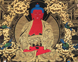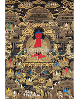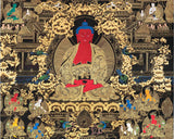 Amitabha Buddha, the Buddha of Infinite Light, is shown with other heavenly beings in the Thangka, a classic Tibetan Buddhist scroll painting. Amitabha is depicted seated in meditation, with a serene presence and hands in meditative mudra. The red hue of his body symbolizes the infinite love and compassion he extends to all sentient beings. The mix of black and gold in this unusual Thangka gives Amitabha Buddha's portrait a rich, refined look. Amitabha is frequently portrayed in a meditative pose with the offering bowl, which represents compassion, and a typical hand mudra of meditation.