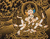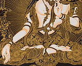 White Tara (Skt. Sita Tara) is also known as Saptalocana Tara, the 'Seven-eyed Saviors', and along with Amitayus and Ushnishavijaya, she appears as one of the three principal Buddhist deities of longevity. Her meditational practices are mainly employed to confer long life, alleviate illnesses, and remove the obstacles that are indicative of an untimely death. Thangkas of White Tara and the 'Trinity of Long-Life Deities' are frequently commissioned for such purposes, and also to auger an auspicious rebirth for a deceased relative or friend.