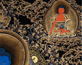 This Medicine Buddha Thangka, accompanied by Amitabha Buddha and Shakyamuni Buddha, can transform your living or working space with healing, inspiration, and cultural significance. It also showcases Tibetan Buddhism's rich cultural heritage. Its vibrant colors and intricate details add artistic elegance, sparking conversation and promoting healing, compassion, and spiritual growth.
