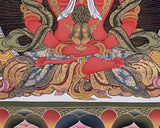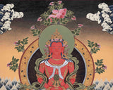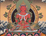 Introduction To The Thangka :A sacred Tibetan Buddhist painting of the Buddha of Infinite Light and Infinite Life is called a Buddha Amitayus Painted Thangka. It shows Amitayus meditating while sitting still and appearing serene. The Thangka acts as a center for devotion, reflection, and wishes for long life and spiritual prosperity. It is painstakingly made with ancient methods and brilliant hues, enticing good vibes and encouraging spiritual development.