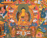 Shakyamuni Buddha is depicted in this thangka together with the two main disciples as it appears in the most classical representations. Buddha is seated in vajra posture on a white moon disc and lotus. Shakyamuni Buddha was an educator upon whose lessons the establishments for Wholesome Dharma were shaped. He is respected as the Supreme Buddha and is the primary edified person to be idolized walking on Two Legs.