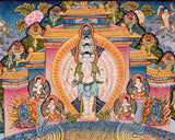 The Buddha Mandala Thangka is a profound representation of Buddhist cosmology, featuring intricate depictions of various deities and symbols. At the center of the mandala sits the Buddha, radiating with serene wisdom and compassion. Above him, the thousand-armed Avalokiteshvara embodies the boundless compassion of the bodhisattva, offering blessings and protection to all sentient beings.