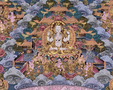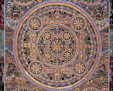 At the mandala's focal point, the serene presence of Gautama Buddha sits in a meditative position, his eyes closed in deep contemplation. His hands are positioned in a teaching or giving gesture, symbolizing the imparting of wisdom and compassion. Surrounding the Buddha are images of various deities, bodhisattvas, and symbols representing different aspects of Buddhist doctrine and practice. The use of real 24K gold paint throughout the thangka adds a touch of opulence and sanctity, enhancing the overall spiritual significance of the artwork.