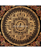 The Gold Style Shakyamuni Mandala is a traditional Tibetan Buddhist artwork featuring Shakyamuni Buddha surrounded by intricate golden embellishments. Buddha Shakyamuni appeared in this world to purify all beings by having them open the treasure of Buddha's Wisdom, which they are unaware of possessing within themselves. Shakyamuni sits at the center in a meditative posture, exuding serenity and wisdom. The use of pure 24K gold throughout the painting adds a sacred and luminous quality. Surrounding Shakyamuni are various deities and symbols, inviting practitioners to contemplate Buddhist teachings and connect with the divine through meditation.