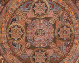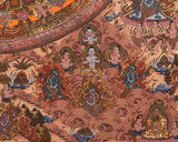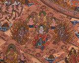 The Buddhist Deity Mandala is a sacred visual map of the enlightened cosmos surrounded by an array of enlightened beings, guardians, and consorts. It is intended to aid spiritual practice and inner development. A skilled artist hand-painted this mandala according to traditional Tibetan sacred art traditions. The base is made of high-quality cotton canvas, providing a durable and smooth surface ideal for illustrating intricate spiritual geometry. Rich layers of acrylic colors are skillfully applied to enhance the depth and richness of the mandala's striking contrasts and symbolic motifs. Genuine 24K gold is used to adorn divine figures and ornamental patterns, creating a dazzling contrast that adds spiritual brilliance and richness to the entire piece.