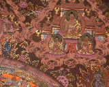 The central figure is surrounded by enlightened beings, guardians, and celestial consorts in concentric layers, symbolizing the journey from delusion to enlightenment. This mandala, used as a meditative aid, embodies the energy of wisdom, compassion, and the powerful force of spiritual cleansing. This mandala is expertly hand-painted with rich, earthy colors, accented with gold and crimson highlights, following traditional Vajrayana depiction. The four cardinal gates, lotus petals, and burning flames that surround the interior palace symbolize spiritual awakening, cleansing, and protection. The surrounding vignettes depict lineage masters and ritual figures, highlighting the passing of blessings from one generation to the next. This mandala is ideal for personal shrines, altars, or spiritual collections, as it provides protection, insight, and a direct connection to tantric wisdom.