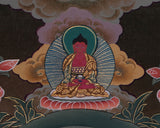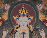 This stunning Chenrezig artwork elegantly depicts Avalokiteshvara, the Bodhisattva of Compassion, with Amitabha Buddha positioned at the top center, symbolizing boundless light and wisdom. This piece is hand-painted on high-quality cotton canvas, providing a sturdy and textured surface that highlights the brilliance of the colors. The artist employs brilliant acrylic colors, selected for their deep vibrancy and enduring brightness, to highlight life's delicate intricacies and beautiful expressions. To enhance its beauty, genuine 24K gold is carefully integrated into the thangka, emphasizing religious motifs and giving it a radiant, spiritual atmosphere. Composed by a Nepali artist using traditional methods, this artwork showcases exceptional work and cultural authenticity as a cherished piece of devotional art.