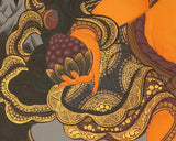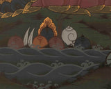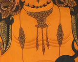 Lord Kubera, the god of wealth, is depicted in this thangka sitting regal. He has a golden-yellow skin and a plump, ornamented body made of gold. He is crowned with a five-pronged headdress that represents the five transcendental Buddhas. The deity is distinguished by his enormous eyes, tilted lips, and unique mustache and beard. His torso is draped in a long, flowing scarf, and below the waist, he is dressed in ultra-fine clothing.He frequently carries a variety of objects in his right hand, such a sword, banner, lemon, or flat cup, but the most recognizable emblem for which he is known is the mongoose (Nakula), which he clutches in his left hand.