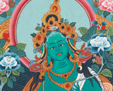 Green Tara is adorned in silken garments and jeweled ornaments. The main difference in the iconography between the green Tara and the white Tara is the position of the legs. Green Tara sits in a posture of ease, with one leg drawn towards her and the other resting on a lotus bud that springs from the pedestal. Her hands are in the mudra of perfect generosity, holding the stems of blue lotus, showing a peaceful and smiling expression.