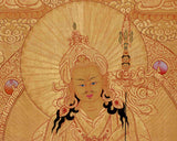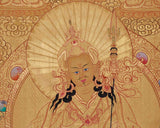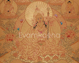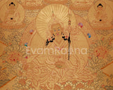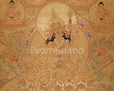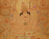 The Full Gold Guru Rinpoche Thangka Painting is a sacred artwork in Tibetan Buddhism, depicting the revered "Second Buddha" and founder of the Nyingma tradition, Guru Padmasambhava. Adorned in gold, seated majestically on a lotus throne with one leg extended, symbolizing enlightenment and transcendence. His right-hand gestures in the mudra of granting blessings, while his left-hand holds a vajra, symbolizing his unwavering commitment to the teachings of enlightenment. He is also known as the "Lotus-Born Guru," Guru Rinpoche's miraculous birth from a lotus symbolizes his transcendence over worldly constraints and his spontaneous arising from the pure realm of enlightened awareness.