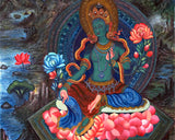 The Genuine Hand-Painted Newari Style Green Tara represents the essence of the Newari artistic tradition and the divine presence of Green Tara, a respected figure in Buddhism. Green Tara, also known as the "Mother of Liberation" is a revered figure representing compassion, wisdom, and swift action. She is a beloved bodhisattva known for her ability to assist and protect sentient beings in their spiritual journey. Green Tara is depicted as a youthful, radiant figure, seated on a lotus throne with one leg extended. Her skin color is portrayed in emerald green, which symbolizes growth, recovery, and energy, which reflects Green Tara's function as a guide and protector.