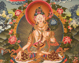 Our Thangka is a hand-painted art of Goddess White Tara. It is a masterpiece of art in a fine quality stretched canvas. It is beautifully painted with natural stone-made colors and 24K gold.