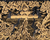 He sits on a lotus base, symbolizing purity and spiritual enlightenment. He is surrounded by exquisite floral designs and swirling clouds that enhance his ethereal and transcendental state of mind. The artwork showcases the powerful symbolism of Amitabha's loving nature and role as a guide for those seeking rebirth in the Pure Land. The rich golden accents on a black background symbolize the light Amitabha emits, bringing tranquility and shelter from worldly pain. This thangka, whether used at a shrine, altar, or as meaningful decor, embodies spiritual elegance and cultural authenticity rooted in Tibetan Buddhist tradition.