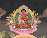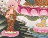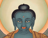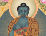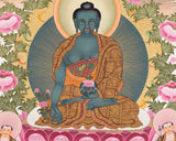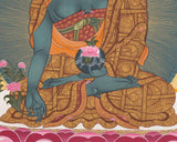 Medicine Buddha is highly practiced among the Himalayan Tibetan Buddhist community. This Buddha thangka is done in traditional Menri style, which is a major painting style from Lhasa, Central Tibet.