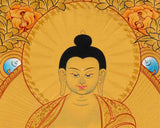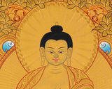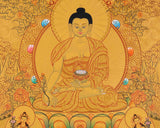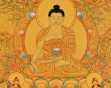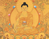 Introducing our Gold Painted Medicine Buddha Thangka, a stunning portrayal of healing and compassion. At the center of this exquisite thangka sits the Medicine Buddha, also known as the Bhaisajyaguru, in a seated posture of deep meditation. His left-hand rests in his lap holding a bowl of healing nectar, while his right hand is extended in the gesture of granting protection and dispelling fear. The Medicine Buddha embodies the supreme healing qualities of enlightenment, offering solace and relief from physical, mental, and spiritual ailments to all sentient beings.