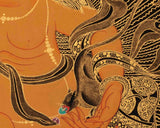 The Gold Style Namtose Thangka Painting is a stunning depiction of Namtose, also known as Vaishravana, who is revered in Tibetan Buddhism as the Guardian King of the North and the god of wealth. This intricate painting showcases Namtose in vibrant, gold hues, symbolizing his association with prosperity, protection, and abundance. The meticulous gold detailing enhances the divine and regal aura of Namtose, making the Thangka not only a spiritual tool but also a magnificent piece of art. The backdrop often features rich, symbolic elements that depict his kingdom and the wealth he bestows upon the faithful. This Thangka serves as a focal point for meditation, helping practitioners invoke Namtose's blessings for material and spiritual prosperity.