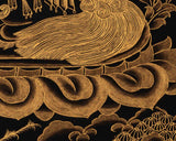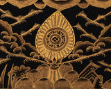 Namtose, often depicted riding a snow lion, represents strength and power, embodying the qualities of a fierce protector and benefactor. He is one of the Four Heavenly Kings, responsible for safeguarding the world and upholding the Dharma. In his right hand, he holds a mongoose spitting out jewels, symbolizing the eradication of greed and the generous distribution of wealth. His imagery is filled with attributes that convey his role as a wealth deity, including the treasure banner and the victory banner, signifying his authority and success in overcoming obstacles. Devotees believe that by honoring Namtose through the Thangka and rituals, they can receive his protection, overcome financial difficulties, and achieve a state of balance and harmony in their lives. The Gold Style Namtose Thangka thus serves as both a spiritual emblem and a reminder of the divine support available in the pursuit of wealth and stability