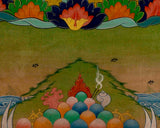 Guru Rinpoche's Traditional Thangka portrays a serene lakeside scene with lush hills and colorful clouds. He wears a monastic robe, a brocade cap, and a gown. He has one face, two arms, and is perched like a king on a lotus with changing hues. Halo, which emanates his white face, is hidden behind his serene countenance. The blue nimbus behind his body is surrounded by a golden outer covering with jewel-studded texture.