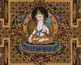 Here White Tara is seen seated on a lotus throne.Her body is white and she is seated in the vajra posture. Her left hand, which is placed on her heart, holds the stem of a blossoming lotus beside her left shoulder.Her right hand is in Varadamudra, symbolizing supreme generosity.She is wearing all six ornaments and looks like a beautiful sixteen-year-old maiden. She has seven eyes, two in the palms of her hand, two in the soles of her feet, and one on her forehead.