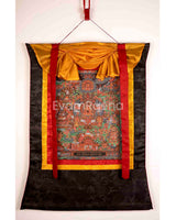 The vintage-style black brocade adds a touch of simplicity and elegance to this traditional masterpiece. The thangka becomes a visual journey through the life of Buddha, capturing significant moments and teachings with an artistic touch.