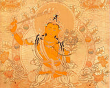 The exquisite Manjushree Thangka is a wonderful work of art that has been meticulously hand-painted. The thangka depicts Manjushree, the bodhisattva of knowledge, in a regal manner, and is encircled by exquisite gold patterns that have been painstakingly made with 24K gold.A stunning work of art that glistens with golden tones is the result of trained artists applying each brushstroke with great care. The thangka's golden background gives it a sense of grandeur and draws attention to Manjushree, the central figure, who is depicted as exuding a spirit of heavenly enlightenment.