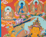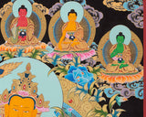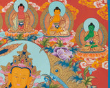 This thangka is of exceptionally high quality, crafted with a beautiful color combination that enhances its visual appeal and spiritual significance. The use of real 24K gold paint throughout the thangka adds a touch of luxury and sanctity, making it not just a piece of art, but a revered object of devotion and meditation.