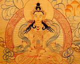 Embrace White Tara's serene presence with the help of this gorgeous thangka that was lovingly hand-painted. The beautiful white complexion and delicate facial features of the deity are highlighted in great detail by the Full Gold style. White Tara rests serenely atop a lotus throne, exuding a sense of peace and tranquility as the essence of compassion and healing. The painting's elaborate iconography further emphasizes the statue's spiritual significance. Every brushstroke is evidence of the artist's commitment and labor of love in producing a work of art that radiates grace and beauty. Displaying this White Tara thangka will allow you to draw the goddess' healing and compassion-filled blessings into your life.
