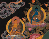 Our High-Quality Amitayus Buddha Thangka Painting depicts Amitayus, the Buddha of Infinite Life, and with other bodhisattva. He is a central figure in Pure Land Buddhism, known for his compassion and promise of salvation. He is shown on a lotus throne holding an elixir of immortality, symbolizing the aspiration for infinite life and liberation from the cycle of birth and death. In Pure Land teachings, practitioners chant his name with devotion, seeking rebirth in his Pure Land, Sukhavati, where they can pursue enlightenment without suffering or distractions. Devotional practices like chanting and visualization help cultivate a deep connection with Amitayus and his Pure Land.
