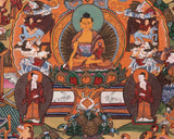 Shakyamuni Buddha is depicted in this thangka together with the two main disciples as it appears in the most classical representations. Buddha is seated in a vajra posture on a white moon disc and lotus. Shakyamuni Buddha was an educator upon whose lessons the establishments for Wholesome Dharma were shaped. He is respected as the Supreme Buddha and is the primary edified person to be idolized walking on Two Legs.
