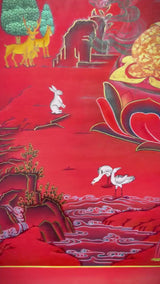 The Manjushri Bodhisattva Thangka, set against a vivid red background, is a captivating expression of Tibetan Buddhist art. This sacred portrayal of Manjushri, wielding a flaming sword of wisdom, symbolizes the power to dispel ignorance. The red backdrop adds intensity to the thangka, enhancing the transformative and dynamic nature of Manjushri's wisdom. This artwork serves as a visual meditation, inviting contemplation of the Bodhisattva's profound teachings and qualities, making it a powerful representation of enlightenment in a compact form.