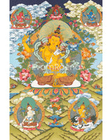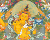 In the Manjushri Thangka Painting, Manjushri is depicted seated on a lotus throne in a meditative posture, embodying serene wisdom and compassion. His golden-orange skin color symbolizes the luminous quality of wisdom, illuminating the minds of sentient beings.