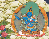 Legend has it that Manjushri was born from a great radiant light that emanated from the crown of Buddha Amitabha. He is often depicted in the thangka holding a sword in his right hand, symbolizing the sharpness of wisdom that cuts through ignorance, and scripture or sutra in his left hand, representing the teachings of enlightenment.