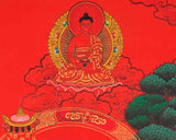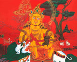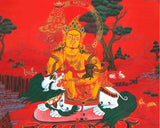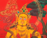 The Namtose Thangka features a mesmerizing portrayal of Namtose against a vibrant red background. The traditional Tibetan artwork captures the essence of Namtose's spirituality, with intricate details and symbolic elements, creating a visually stunning and spiritually rich piece. The Namtose Thangka serves as not only a visually stunning piece but also a spiritual focal point.