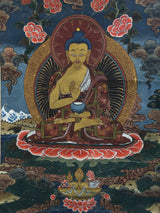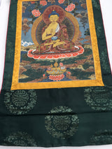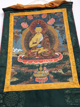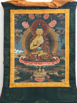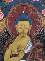 Our Old Blessing Buddha Thangka Painting is a captivating Tibetan Buddhist thangka, portraying the Buddha seated in a meditative posture. framed with a traditional silk brocade enhancing its cultural richness and aesthetic appeal. The Buddha is depicted in a serene and meditative stance and exudes an aura of peace and tranquility.