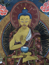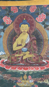 Moreover, this thangka carries a sense of history and authenticity, having been in the collection for over 30 years. Its vintage nature may manifest in subtle cracks and weathered textures, adding to its unique charm and individuality. These imperfections serve as reminders of its journey through time, enriching its authenticity and character. The Vintage Thangka Painting is not only a visually stunning representation of the Buddha's blessings but also a cherished artifact embedded with a rich history and vintage charm.