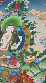 Devotees turn to the 4-Armed Chenrezig for blessings of compassion and guidance in navigating life's challenges. His compassionate presence is believed to offer solace and assistance to those facing difficulties, inspiring hope and resilience. Thangkas portraying this form of Chenrezig serve as influential visual aids, not only depicting his compassionate qualities but also inspiring practitioners on their path to enlightenment. Through meditation and contemplation upon these Thangkas, practitioners deepen their connection to Chenrezig's compassionate energy, fostering greater compassion and empathy in their own lives. Thus, the 4-Armed Chenrezig continues to be revered as a guiding figure in Tibetan Buddhist practice, offering profound spiritual support to all who seek his blessings.