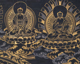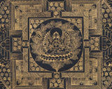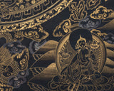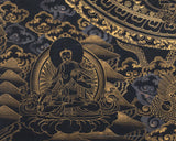 A gold and black style Chenrezig Mandala Thangka is a striking and intricate piece of Tibetan Buddhist art, characterized by its rich use of gold against a dramatic black background. At the center of the mandala sits Chenrezig, the bodhisattva of compassion, depicted in a meditative posture with a serene and compassionate expression. The surrounding mandala structure is meticulously detailed with concentric circles and geometric patterns, representing the cosmos and the path to enlightenment. The use of gold highlights the divine and luminous qualities of Chenrezig and the mandala, creating a shimmering effect that contrasts beautifully with the black background, symbolizing the transcendence of ignorance. The intricate designs include auspicious symbols, lotus flowers, and smaller depictions of other enlightened beings, each carefully painted to enhance the spiritual narrative.
