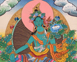 Surrounding the thangka are lotus flowers, symbolizing purity and enlightenment, and a lush green landscape, symbolizing wisdom and compassion. Displaying a Green Tara thangka is a spiritual reminder of compassion, protection, and swift action, inspiring devotees to cultivate these qualities and seek guidance.