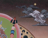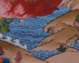 Guru Rinpoche, also known as Padmasambhava, is a revered figure in Tibetan Buddhism, known as the "Second Buddha" and the mastermind behind the establishment of Buddhism in Tibet. Born in the 8th century in the Swat Valley of Pakistan, he was invited to Tibet by King Trisong Detsen to subdue negative forces obstructing Buddhism's spread. His arrival marked the beginning of a new era for Buddhism in the region, as he tamed local deities and demons, transforming them into protectors of the Dharma. He imparted numerous teachings and initiated many disciples, laying the foundation for the Nyingma tradition, the oldest school of Tibetan Buddhism. His teachings emphasize compassion, wisdom, and skillful means of attaining enlightenment, and his methods are still widely practiced in Tibetan Buddhism. His legacy extends beyond Tibet, inspiring millions of devotees worldwide to seek spiritual protection, healing, and guidance on the path to awakening. This Original Hand-Painted Guru Rinpoche Thangka is a divine masterpiece, depicting his enlightened essence in vibrant colors and intricate details.