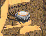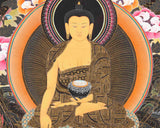 The Original Hand-Painted Shakyamuni Buddha Thangka beautifully portrays the enlightened figure of Shakyamuni Buddha, the historical Buddha who attained enlightenment under the Bodhi tree over 2,500 years ago. Shakyamuni Buddha is depicted in the center of the Thangka, seated in the earth-touching gesture (bhumisparsha mudra), symbolizing his moment of enlightenment. His serene countenance and gentle demeanor exude tranquility and wisdom, inviting viewers to contemplate the teachings of compassion and enlightenment.