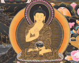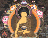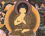 The Shakyamuni Buddha Thangka serves as a powerful visual representation of Buddhist teachings and principles, inviting viewers to connect with the timeless wisdom and compassion of the Buddha and his enlightened lineage.