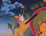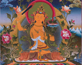 Decorate your space with a Manjushri Thangka, a revered Bodhisattva of Wisdom in Tibetan Buddhism. His dynamic stance and flaming sword symbolize wisdom and insight, guiding your spiritual journey. This Buddhist art brings serenity and enlightenment.