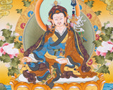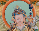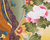 Introduction To The Thangka :Guru Padma Sambhava, popularly known as Guru Rinpoche, the precious teacher was a powerful Tantric Buddhist Master. He subdued many harmful spirits and forces that hindered the spread of the teachings of Buddha Shakyamuni. With his miraculous powers, he taught many disciples who also became perfect masters of Tantric Buddhism. He is said to have twenty-five great disciples who were instrumental in preserving the sacred teachings of Lord Buddha to the present day.