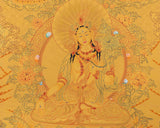 The Full Gold White Tara Thangka Painting is an exquisite representation of White Tara, a revered deity in Tibetan Buddhism known for her boundless compassion, healing powers, and ability to bestow long life. White Tara, also known as Sitatapatra, is depicted seated in a lotus position, embodying purity and serenity. She is distinguished by her seven eyes – two on her face, one on each of her hands and feet, and one on her forehead – which symbolize her vigilant compassion and omniscient ability to perceive the suffering of all beings. This thangka, adorned with radiant gold leaf, amplifies her divine and ethereal quality, making her figure stand out with an otherworldly glow. The intricate details, from the delicate lotus flowers she holds to the elaborate patterns on her garments, reflect the meticulous craftsmanship and deep spiritual significance embedded in this piece of art. The use of gold not only enhances the visual appeal but also signifies the purity, enlightenment, and timeless nature of White Tara.