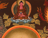 This hand-painted thangka depicts Shakyamuni Buddha sitting on a lotus platform upon a singhashan(Lion Throne).