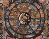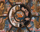 The six sections, surrounding the central circle, show representations of the six realms - the realm of the gods, the realm of the titans, the realm of the humans, the realm of the animals, the realm of the hungry ghosts and the realm of the demons.