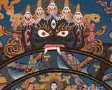 Yama, the Lord of Death, holding the Wheel of Life which represents Samsara, or the world on a Tibetan Thangka. In the central circle is a snake chasing a pig chasing a rooster chasing the snake which represents craving, hatred and ignorance.