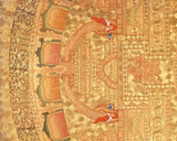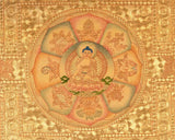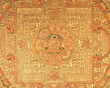 This Full Gold Mandala is a sacred geometric pattern, that occupies a central place. Surrounding Shakyamuni Buddha, the Mandala in this Thangka serves as a powerful symbol of the intricate interconnection of all aspects of existence and the profound harmony inherent in the universe's order. Within this sacred geometric pattern, Shakyamuni Buddha stands as the focal point, revered for his attainment of enlightenment and dissemination of timeless teachings.